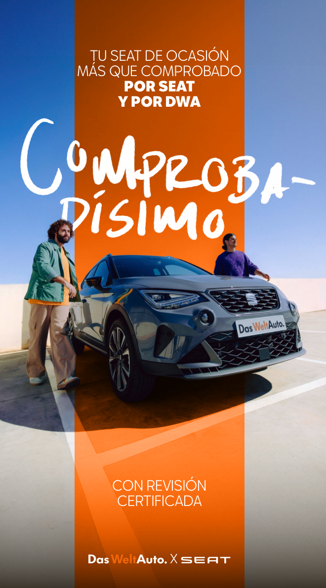 *Bonificación sobre PVP, IVA incluido, para clientes particulares y autónomos en Península y Baleares que financien a través de Volkswagen Bank GmbH S.E (según condiciones contractuales), aplicable a todos los vehículos Das WeltAuto de las marcas SEAT y Volkswagen, con hasta dos años de antigüedad disponibles en la Red Das WeltAuto sujeta a un capital mínimo de 16.000 € y una duración y permanencia mínima de la financiación de 60 meses. Ejemplo de cuota: importe a financiar de 16.000,00€. Sin entrada. 60 cuotas de 347,32€/mes. Comisión de apertura al contado: 480,00€ (3,00%). Importe de los intereses 4.103,65€. Coste total del crédito 4.583,65€. Importe total adeudado: 21.319,20€. Precio total a plazos: 21.319,20€. TIN: 8,99%. TAE: 10,74%. Sistema de amortización francés. La oferta incluye Seguro de Protección de Pago Básico opcional y financiado por 735,55€ que no está incluido como gasto en el cálculo de la TAE. La oferta incluye gratis 2 años de Mantenimiento o 40.000km (lo que suceda antes) y Extensión de Garantía de un año sin coste adicional para vehículos financiados con Volkswagen Bank GmbH S.E Incompatible con otras ofertas financieras. Oferta válida para unidades comercializadas hasta fin de Salón VO. Incompatible con otras ofertas financieras.